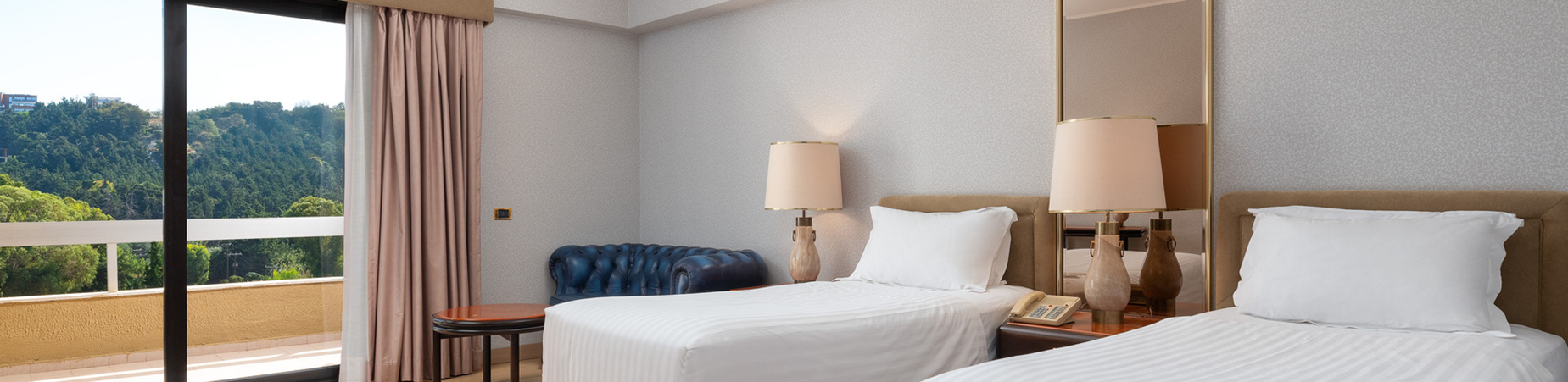 Blending classic style with comfort and space, these rooms are designed in a Mini-Suite style, offering a total area of 45 m2 (with balcony). They feature an elegant seating area with a leather Chesterfield sofa, a walnut desk and double or twin beds of exceptional quality.