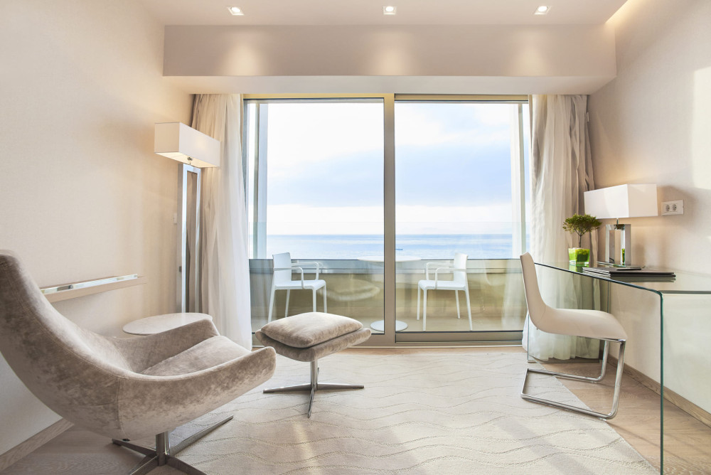 These modern 25 m² rooms in earth tone colours, offer uninterrupted views of the Aegean Sea whilst touching the sky.