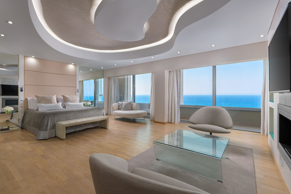 Each Presidential Suite consists of two large rooms: A spacious sitting and dining room for more than 6 persons, with a fully equipped bar and guest WC and a master bedroom that incorporates a desk, a sitting area, a dressing area (boudoir) and the bedroom with king-size bed. The luxurious marble bathroom features a Jacuzzi. Both the bedroom and dining room have separate entrances and ceiling-high windows. At the balcony, the panoramic view of the Aegean Sea fascinates guests. The suites also feature 2 Flat screen TVs, 5 telephone sets, a hi-fi system, electronic alarm-clock and Internet Connection. The Linens of the suites are of Frette Italy and the silverware has been provided by the renowned companies Badeo & Christofle.