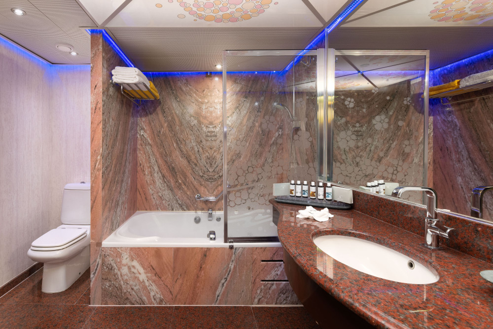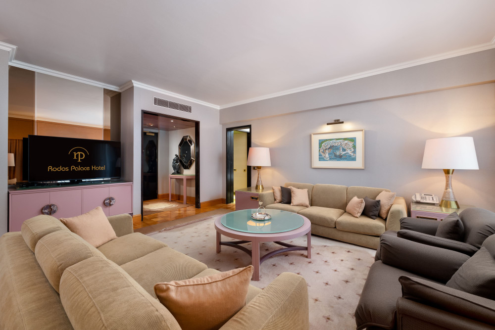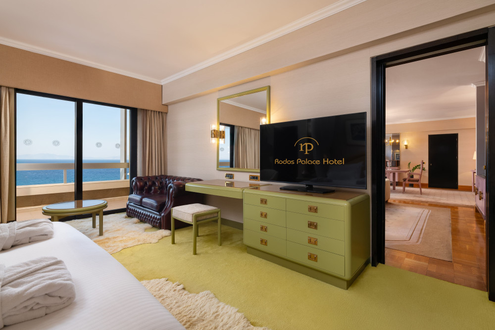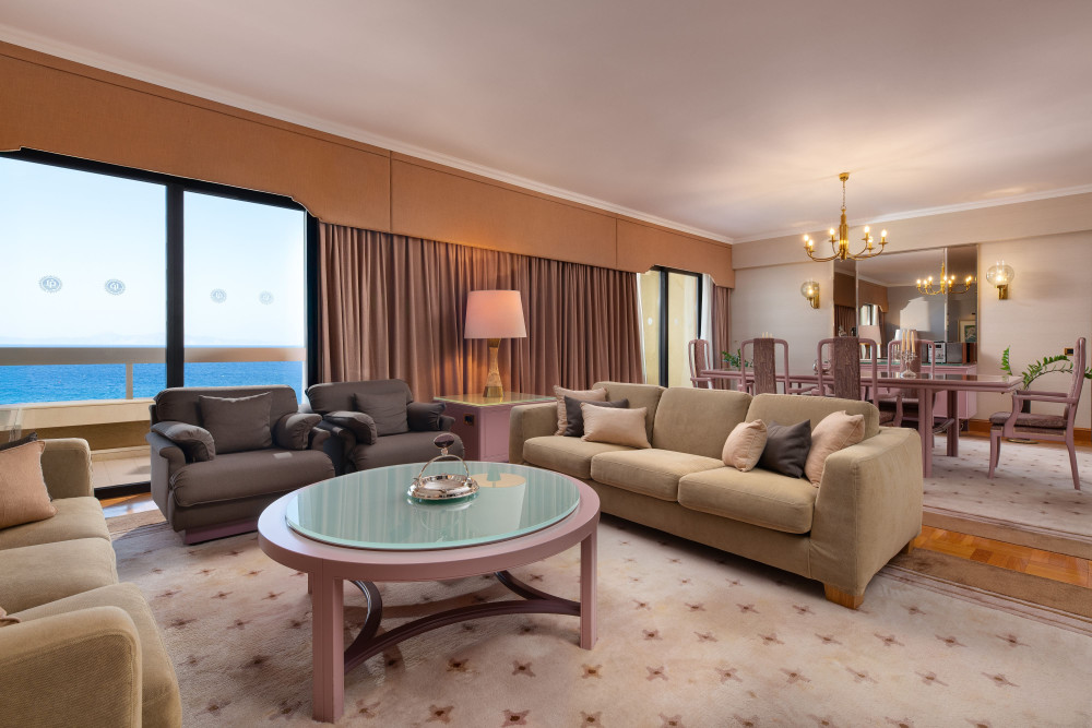 In-room facilities & equipment include: spacious balconies with wide French windows allowing guests to enjoy the magnificent views of the Aegean Sea, 5 direct dial telephone sets with voice mail including a wireless telephone set for convenience, 2 Flat Screen TVs. The Linens of the Suite have been provided by Frette Italy and the silverware by the renowned Companies Christofle and Badeo.