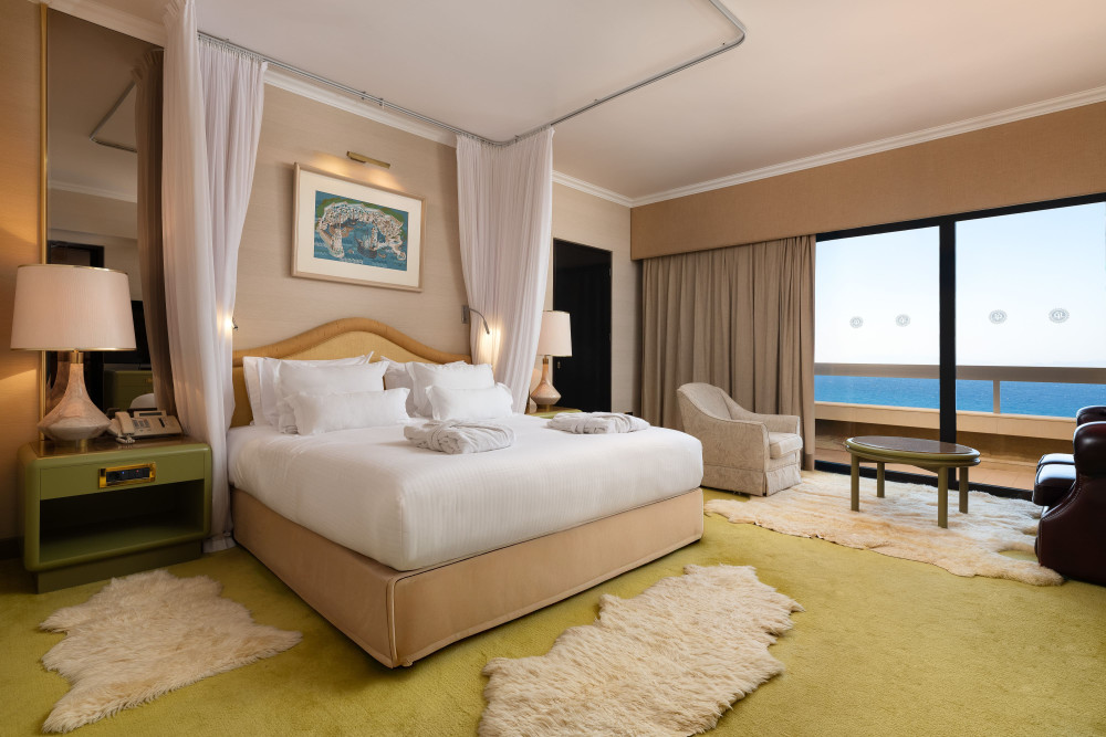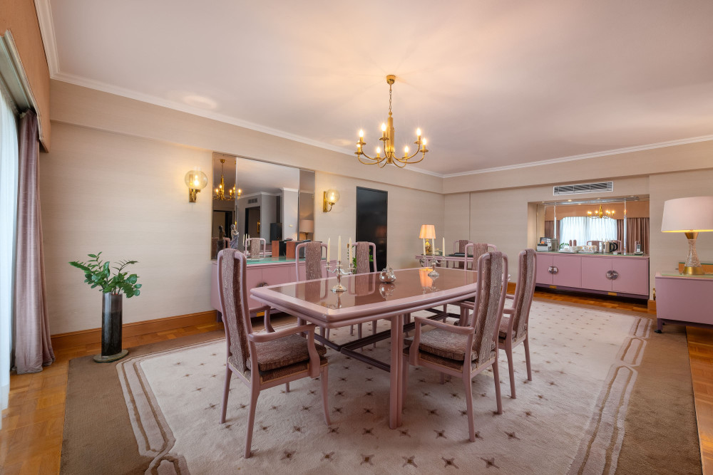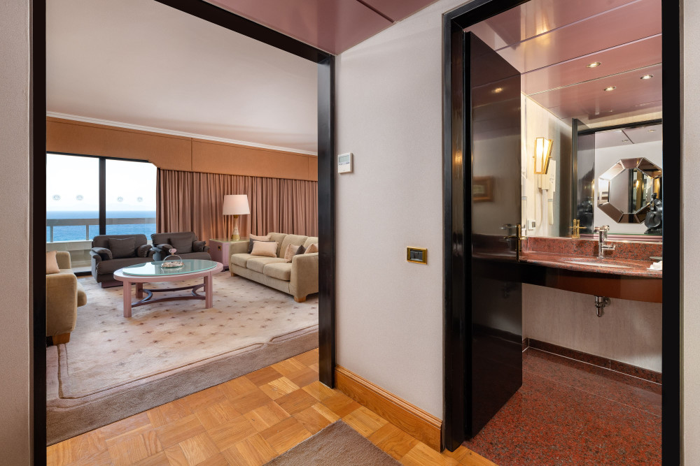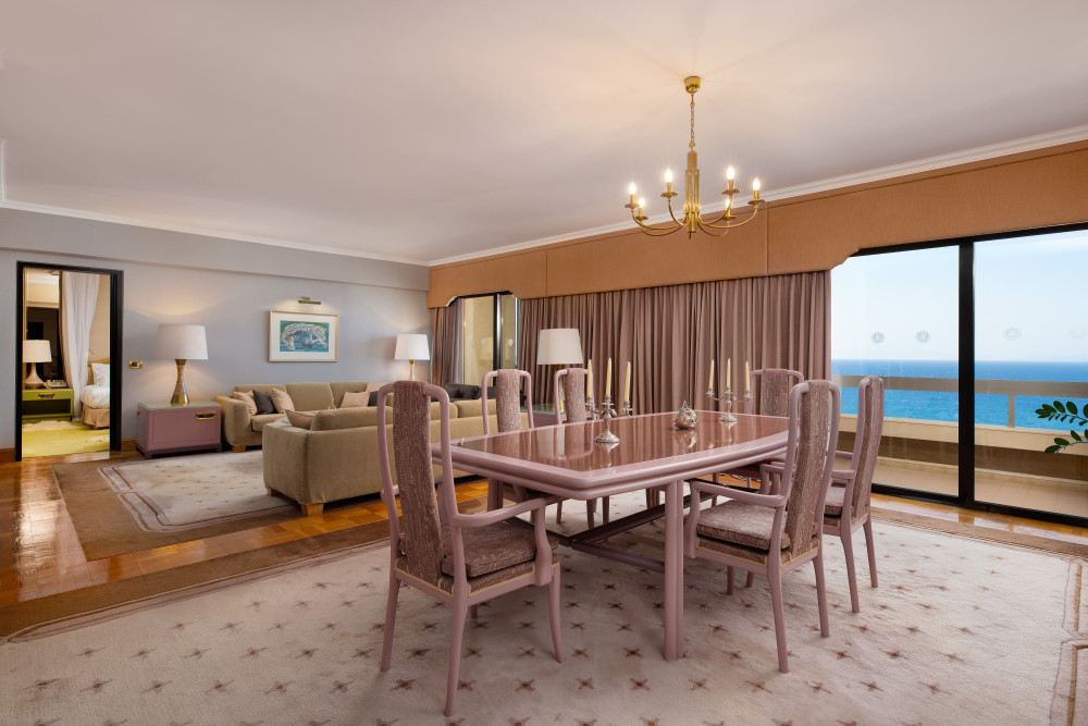 Located on the top floor of the Executive VIP Wing, the Royal Suite represents utmost luxury, convenience and comfort. World famous personalities, celebrities and VIPs from Politics, Science, Arts and Culture, the Queen of Jordan, Heads of State and Stars have stayed in this Suite. The Royal Suite has been designed by the renowned hotel designer Maurice Bailey, who also carefully designed the furniture of the suite. The suite is exceptionally spacious and consists of a bedroom and an ample living room with dining area. Soft beige and pink colors prevail and only the finest materials for carpets, upholstery, wall coverings and curtains have been selected to provide a unique air of luxurious elegance and prestige to its distinguished guests. The living room includes the lounge, a dining area for over 6 persons, an executive desk, a fully organized bar and a guest WC. The bedroom incorporates a sitting area with leather Chesterfield Sofa, a dressing area and mirrored closets. The ample and luxurious bathroom fitted with marble and mirrors includes a wide Jacuzzi bathtub, a telephone set, hairdryer and a complete array of Luxury Bathroom amenities.